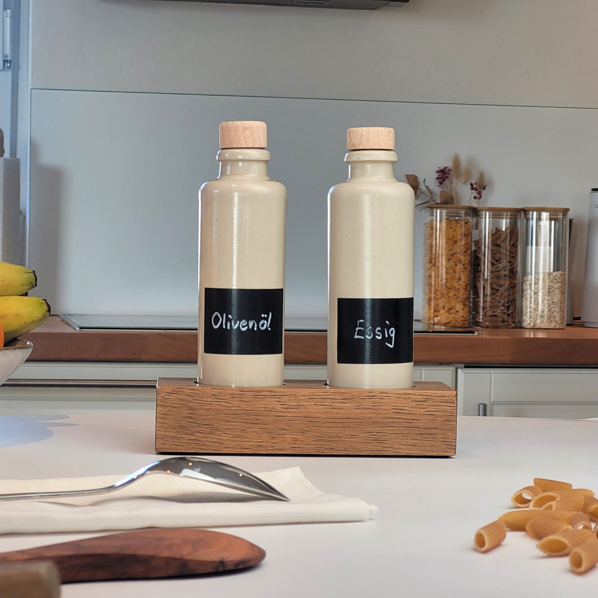 In diesem Set erhalten Sie einen handgefertigten Flaschenhalter aus Eichenholz, hochwertige Keramik-Ölflaschen mit individuell beschreibbaren Etiketten sowie praktisches Zubehör für ein sauberes Eingießen und eine einfache Kennzeichnung – perfekt, um Ihre Küche stilvoll und übersichtlich zu gestalten.
