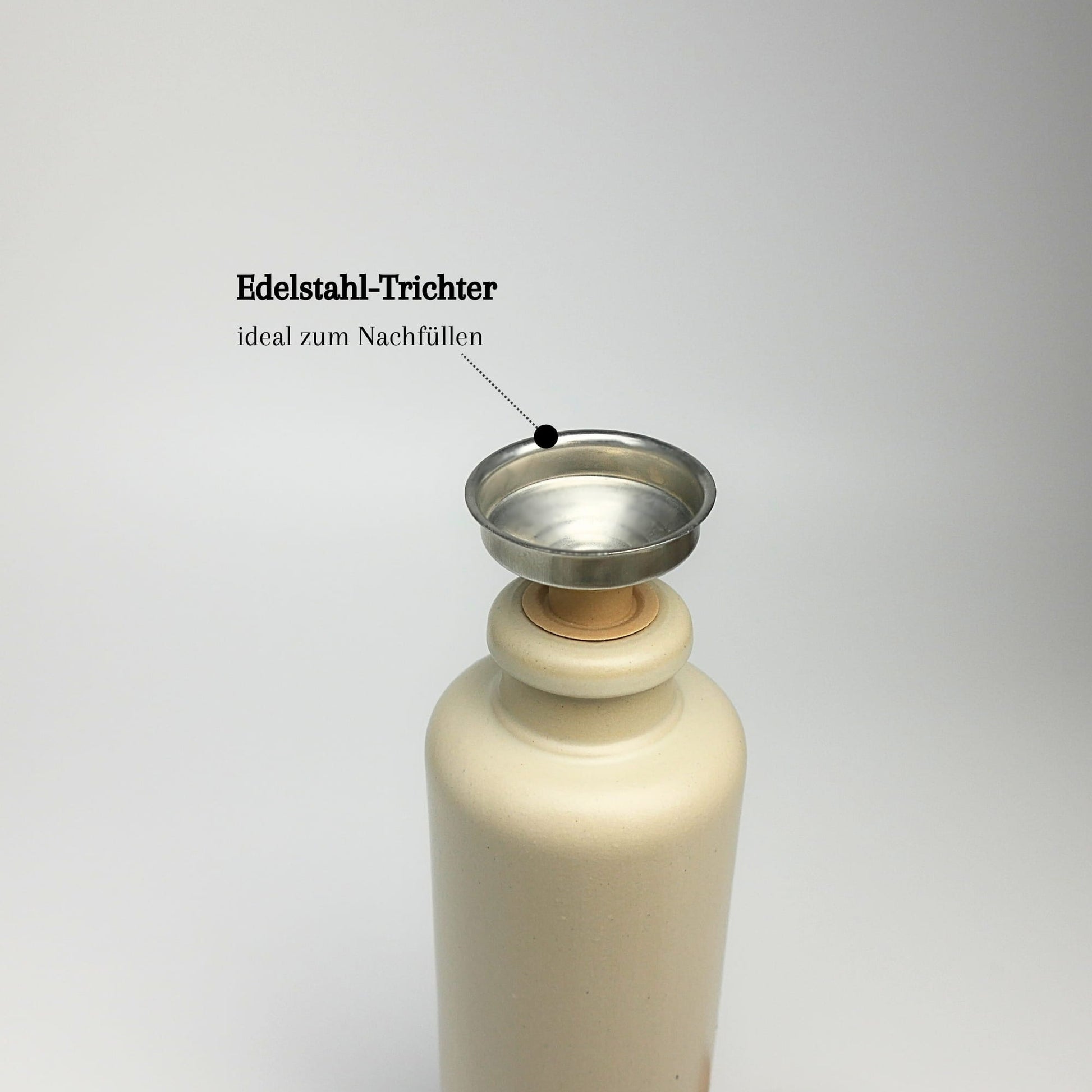Die 200ml Keramikflaschen sind robust, aus hochwertigem Steinzeug gefertigt und mit einer natürlichen Glasur veredelt. Jede Flasche wird in Deutschland gefertigt. Sie eignet sich perfekt für Olivenöl, Speiseöl, Essig oder andere Flüssigkeiten. Durch ihr schlichtes Design wird die Flasche zum dekorativen Highlight in jeder Küche.