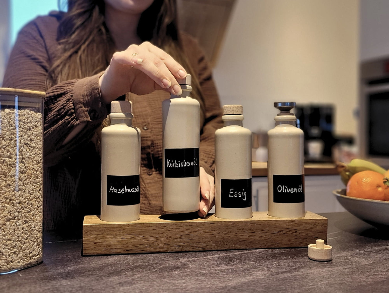 Mit diesem Set bringen Sie sofort Ordnung in Ihre Küche und schaffen einen aufgeräumten, hochwertigen Look auf der Arbeitsfläche. Die Keramikflaschen stehen sicher im handgefertigten Holzhalter, sind übersichtlich angeordnet und werden zum stilvollen Blickfang. Ihre Küche wirkt auf Anhieb ruhiger und strukturierter.
